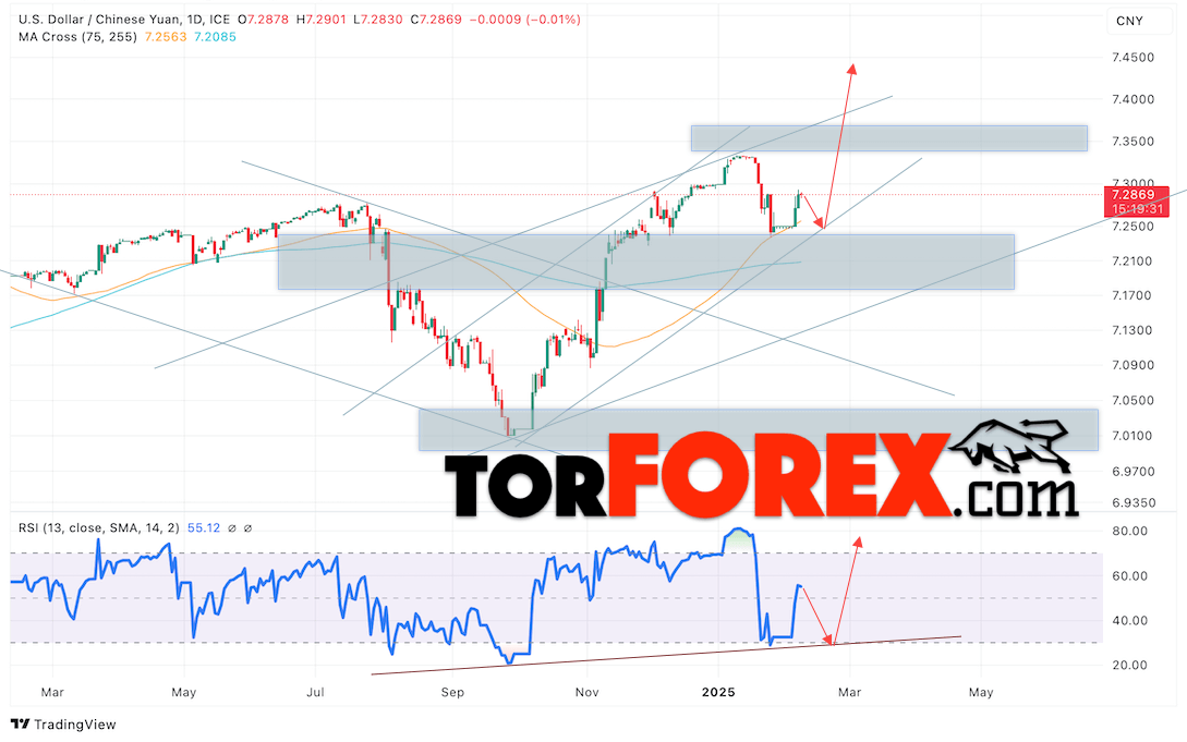 Дополнительным сигналом в пользу роста валютной пары USD/CNY 10 — 14 февраля 2025 выступит отбой от области поддержки на индикаторе относительной силы (RSI). Вторым сигналом станет отток от нижней границы бычьего канала. Отменой варианта подъёма пары USD/CNY на Форекс станет падение котировок и пробой уровня 7.2005 Юаней за Доллар. Это укажет на пробой области поддержки и продолжение падения пары Доллар Китайский Юань в область ниже уровня 7.1445. Подтверждением росту пары выступит пробой области сопротивления и закрытие котировок актива над уровнем 7.3275.