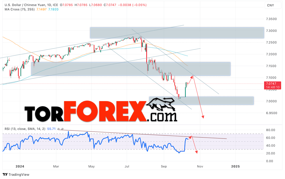 Дополнительным сигналом в пользу подъёма валютной пары USD/CNY 14 — 18 октября 2024 выступит тест линии тренда на индикаторе относительной силы (RSI). Вторым сигналом станет отток от верхней границы медвежьего канала. Отменой варианта снижения пары USD/CNY на Форекс станет сильный рост котировок и пробой уровня 7.1250 Юаней за Доллар. Это укажет на пробой области сопротивления и продолжение роста пары Доллар Китайский Юань в область выше уровня 7.1605. Подтверждением падению пары выступит пробой области поддержки и закрытие котировок актива над уровнем 6.9905.