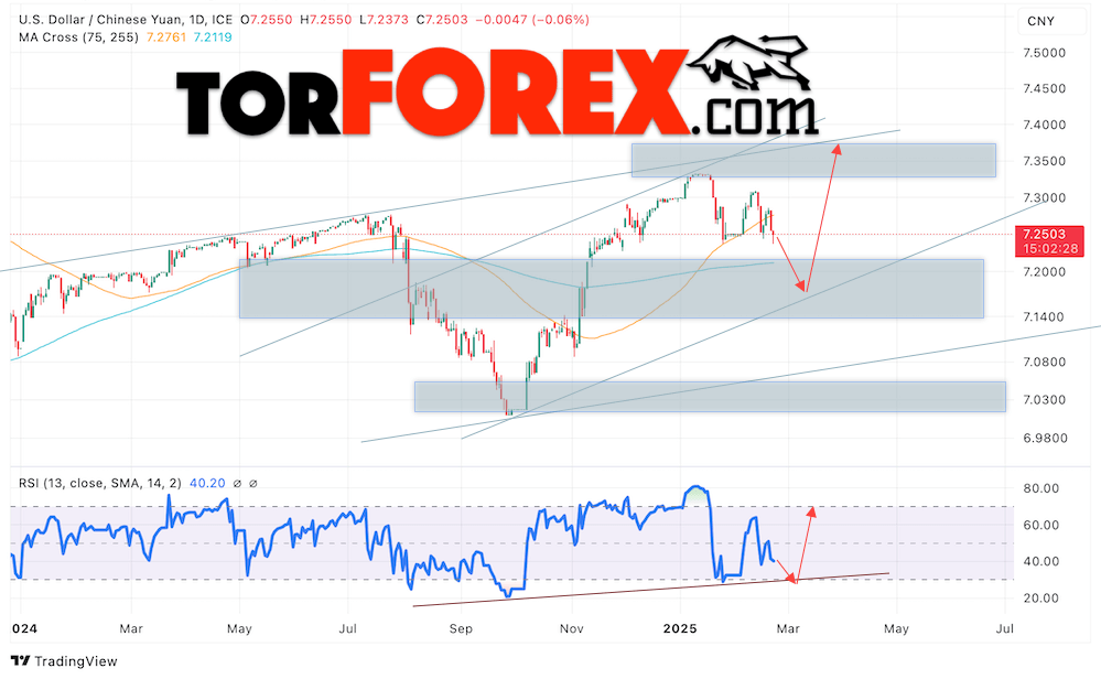 Дополнительным сигналом в пользу роста валютной пары USD/CNY 24 — 28 февраля 2025 выступит отбой от области поддержки на индикаторе относительной силы (RSI). Вторым сигналом станет отток от нижней границы бычьего канала. Отменой варианта роста USD/CNY на Форекс станет падение котировок и пробой уровня 7.1105 Юаней за Доллар. Это укажет на пробой области поддержки и продолжение падения пары Доллар Китайский Юань в область ниже уровня 7.0535. Подтверждением роста пары выступит пробой области сопротивления и закрытие котировок актива над уровнем 7.3205.