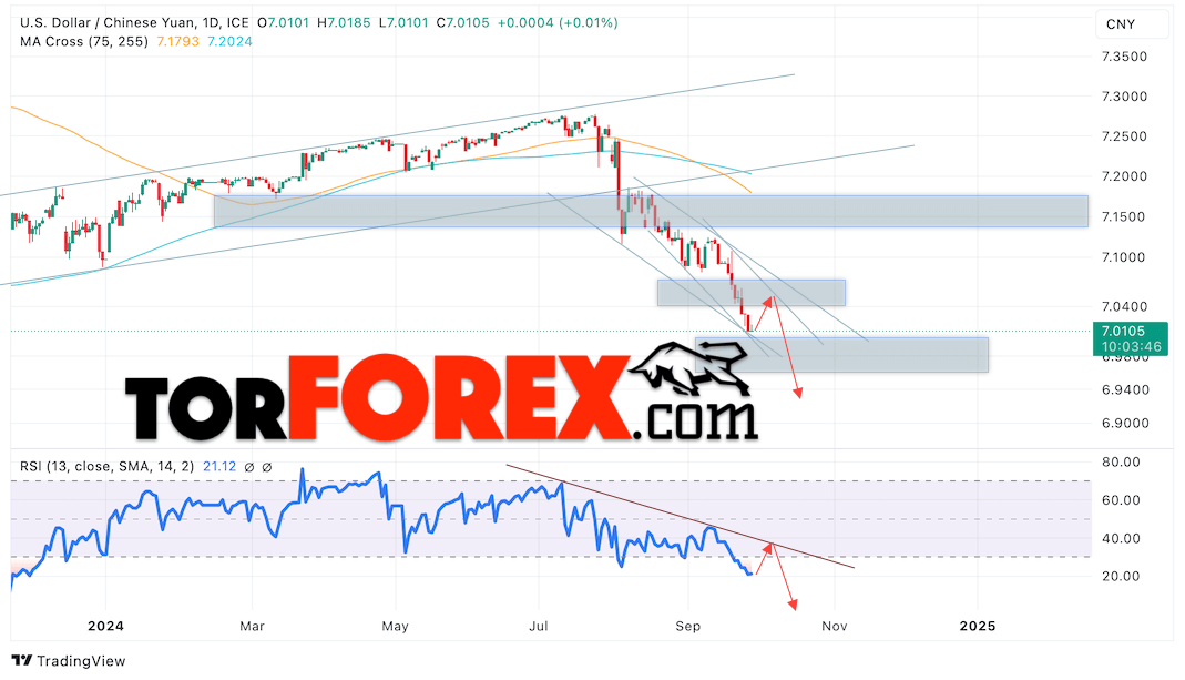 Дополнительным сигналом в пользу подъёма валютной пары USD/CNY 30 сентября — 4 октября 2024 выступит тест линии тренда на индикаторе относительной силы (RSI). Вторым сигналом станет отток от верхней границы медвежьего канала. Отменой варианта снижения пары USD/CNY на Форекс станет сильный рост котировок и пробой уровня 7.07 Юаней за Доллар. Это укажет на пробой области сопротивления и продолжение роста пары Доллар Китайский Юань в область выше уровня 7.12. Подтверждением падению пары выступит пробой области поддержки и закрытие котировок актива над уровнем 6.98.
