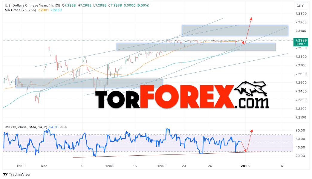 Валютная пара Доллар Китайский Юань USDCNY продолжает движение в рамках развития затяжной боковой коррекции и бычьего канала. В момент публикации прогноза курс Доллара США к Китайскому Юаню составляет 7.2988. Скользящие средние указывают на наличие краткосрочной бычьей тенденции. Цены пробили область между сигнальными линиями вверх, что указывает на давление со стороны покупателей американской валюты и потенциальное продолжение роста Доллара США против Китайского Юаня. В рамках прогноза курса Доллара на 1 января 2025 стоит ожидать попытку развития падения цены и тест уровня поддержки вблизи отметки 7.2895 Юаней за Доллар США. Затем, отскок вверх и продолжение роста валютной пары в область выше уровня 7.3265.