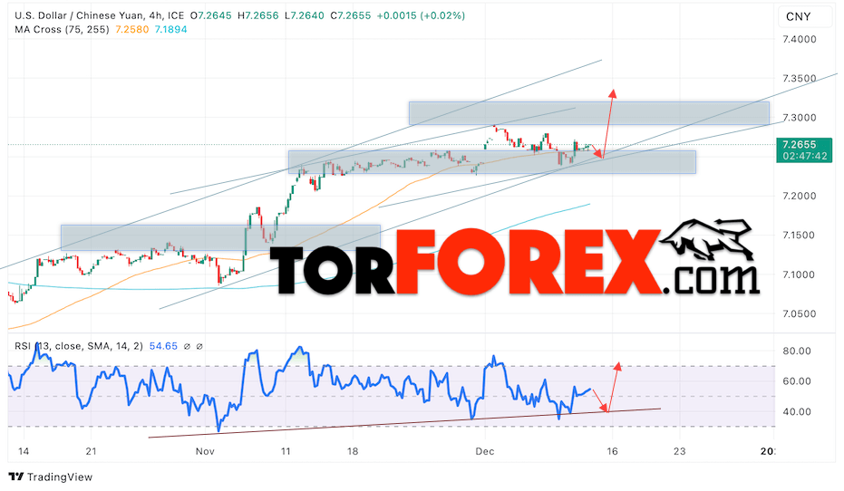Валютная пара Доллар Китайский Юань USDCNY продолжает движение в рамках развития коррекции и бычьего канала. В момент публикации прогноза курс Доллара США к Китайскому Юаню составляет 7.2655. Скользящие средние указывают на наличие краткосрочной восходящей тенденции. Цены пробили область между сигнальными линиями вверх, что указывает на давление со стороны покупателей американской валюты и потенциальное продолжение роста Доллара США против Китайского Юаня. В рамках прогноза курса Доллара на 13 декабря 2024 стоит ожидать попытку развития падения цены и тест уровня поддержки вблизи отметки 7.2435 Юаней за Доллар США. Затем, отскок вверх и продолжение роста валютной пары в область выше уровня 7.3325.