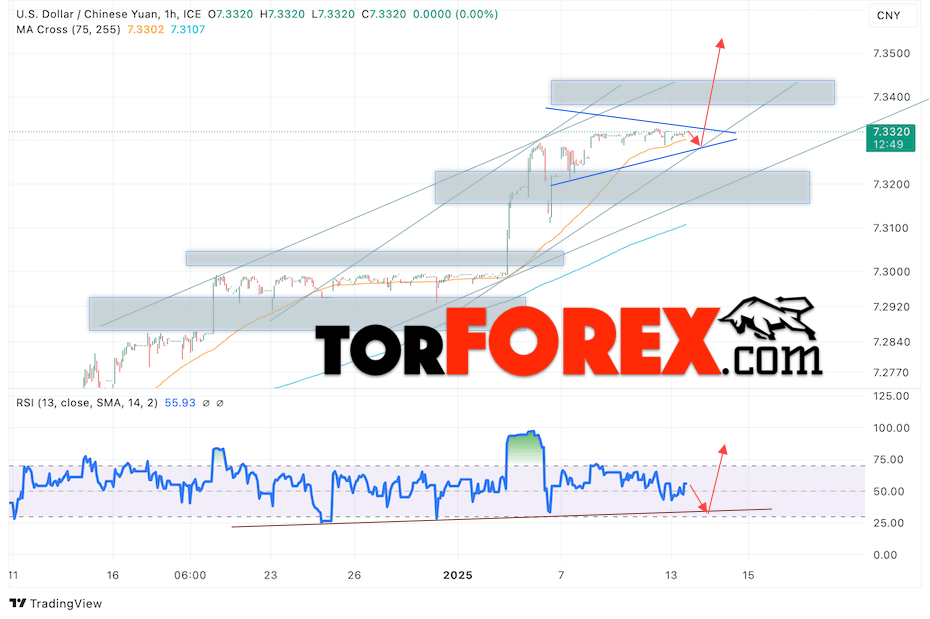Валютная пара Доллар Китайский Юань USDCNY продолжает движение в рамках развития коррекции и формирования модели «Треугольник». В момент публикации прогноза курс Доллара США к Китайскому Юаню составляет 7.3320. Скользящие средние указывают на наличие краткосрочной бычьей тенденции. Цены пробили область между сигнальными линиями вверх, что указывает на давление со стороны покупателей американской валюты и потенциальное продолжение роста Доллара США против Китайского Юаня. В рамках прогноза курса Доллара на 14 января 2025 стоит ожидать попытку развития коррекции цены и тест уровня поддержки вблизи отметки 7.3245 Юаней за Доллар США. Затем, отскок вверх и продолжение роста валютной пары в область выше уровня 7.3545.
