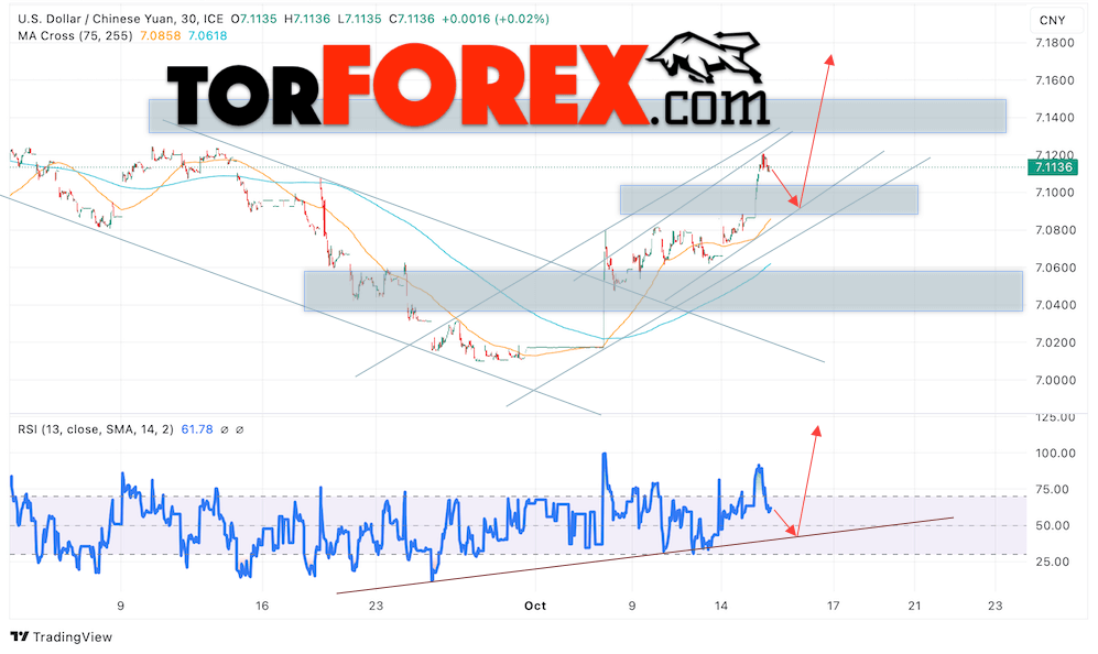 Дополнительным сигналом в пользу подъёма валютной пары USD/CNY 16 октября 2024 выступит тест линии тренда на индикаторе относительной силы (RSI). Вторым сигналом станет отток от верхней границы медвежьего канала, который был пробит покупателями вверх. Отменой варианта подъёма пары USD/CNY на Форекс станет падение котировок и пробой уровня 7.0620 Юаней за Доллар. Это укажет на пробой области поддержки и продолжение падения пары Доллар Китайский Юань в область ниже уровня 7.0005. Подтверждением росту пары выступит пробой области поддержки и закрытие котировок актива над уровнем 7.1260.