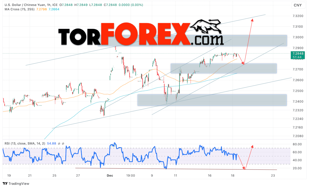 Валютная пара Доллар Китайский Юань USDCNY продолжает движение в рамках развития незначительного подъёма и восходящего канала. В момент публикации прогноза курс Доллара США к Китайскому Юаню составляет 7.2848. Скользящие средние указывают на наличие краткосрочной бычьей тенденции. Цены пробили область между сигнальными линиями вверх, что указывает на давление со стороны покупателей американской валюты и потенциальное продолжение роста Доллара США против Китайского Юаня. В рамках прогноза курса Доллара на 19 декабря 2024 стоит ожидать попытку развития падения цены и тест уровня поддержки вблизи отметки 7.2705 Юаней за Доллар США. Затем, отскок вверх и продолжение роста валютной пары в область выше уровня 7.3185.