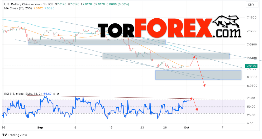 Дополнительным сигналом в пользу подъёма валютной пары USD/CNY 2 октября 2024 выступит тест линии тренда на индикаторе относительной силы (RSI). Вторым сигналом станет отток от верхней границы медвежьего канала. Отменой варианта снижения пары USD/CNY на Форекс станет сильный рост котировок и пробой уровня 7.09 Юаней за Доллар. Это укажет на пробой области сопротивления и продолжение роста пары Доллар Китайский Юань в область выше уровня 7.13. Подтверждением падению пары выступит пробой области поддержки и закрытие котировок актива над уровнем 7.00.