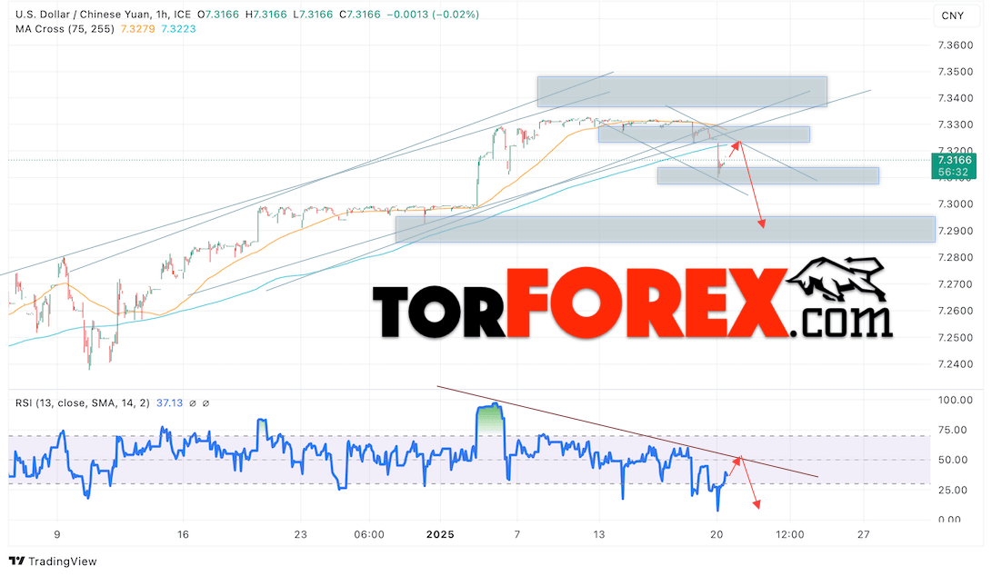 Дополнительным сигналом в пользу падения валютной пары USD/CNY 21 января 2025 выступит тест медвежьей линии тренда на индикаторе относительной силы (RSI). Вторым сигналом станет отскок от верхней границы нисходящего канала. Отменой варианта с падением пары USD/CNY на Форекс станет сильный рост котировок и пробой уровня 7.3345 Юаней за Доллар. Это укажет на пробой области сопротивления и продолжение подъёма пары Доллар Китайский Юань в область выше уровня 7.3675. Подтверждением падению валютной пары выступит пробой области поддержки и закрытие котировок актива под уровнем 7.2965.