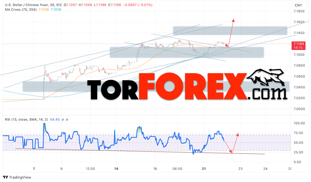 Валютная пара Доллар Китайский Юань USDCNY продолжает движение в рамках роста и бычьего канала. В момент публикации прогноза курс Доллара США к Китайскому Юаню составляет 7.1199. Скользящие средние указывают на наличие краткосрочной бычьей тенденции. Цены пробили область между сигнальными линиями вверх, что указывает на давление со стороны покупателей американской валюты и потенциальное продолжение роста Доллара США против Китайского Юаня. В рамках прогноза курса Доллара на 23 октября 2024 стоит ожидать попытку развития снижения цены и тест уровня поддержки вблизи области 7.1075 Юаней за Доллар США. Затем, отскок вверх и продолжение роста валютной пары в область выше уровня 7.1645.