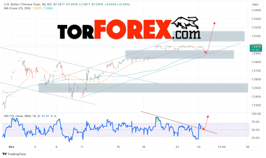 Дополнительным сигналом в пользу роста валютной пары USD/CNY 26 декабря 2024 выступит тест восходящей линии тренда на индикаторе относительной силы (RSI). Вторым сигналом станет отскок от нижней границы бычьего канала. Отменой варианта роста пары USD/CNY на Форекс станет падение котировок и пробой уровня 7.2735 Юаней за Доллар. Это укажет на пробой области поддержки и продолжение падения пары Доллар Китайский Юань в область ниже уровня 7.2065. Подтверждением росту валютной пары выступит пробой области сопротивления и закрытие котировок актива над уровнем 7.3105.