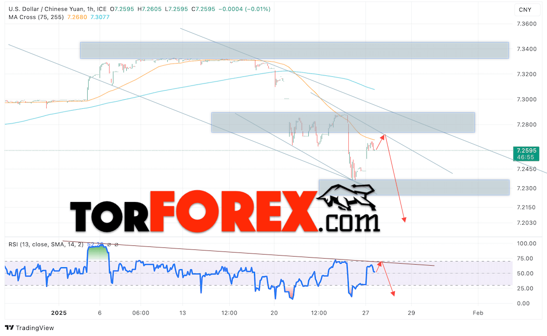 Дополнительным сигналом в пользу подъёма валютной пары USD/CNY 28 января 2025 выступит тест нисходящей линии тренда на индикаторе относительной силы (RSI). Вторым сигналом станет отскок от верхней границы медвежьего канала. Отменой варианта с ростом пары USD/CNY на Форекс станет падение котировок и пробой уровня 7.2865 Юаней за Доллар. Это укажет на пробой области сопротивления и продолжение роста пары Доллар Китайский Юань в область выше уровня 7.3265. Подтверждением падению валютной пары выступит пробой области поддержки и закрытие котировок актива под уровнем 7.2445.
