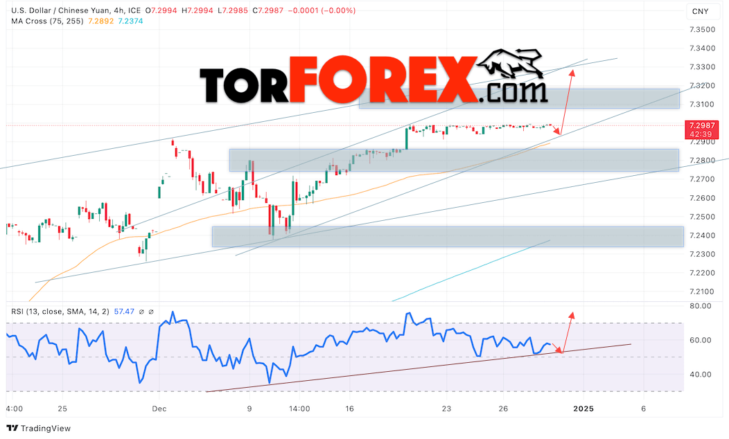 Валютная пара Доллар Китайский Юань USDCNY продолжает движение в рамках развития боковой коррекции и бычьего канала. В момент публикации прогноза курс Доллара США к Китайскому Юаню составляет 7.2987. Скользящие средние указывают на наличие краткосрочной бычьей тенденции. Цены пробили область между сигнальными линиями вверх, что указывает на давление со стороны покупателей американской валюты и потенциальное продолжение роста Доллара США против Китайского Юаня. В рамках прогноза курса Доллара на 31 декабря 2024 стоит ожидать попытку развития падения цены и тест уровня поддержки вблизи отметки 7.2925 Юаней за Доллар США. Затем, отскок вверх и продолжение роста валютной пары в область выше уровня 7.3305.