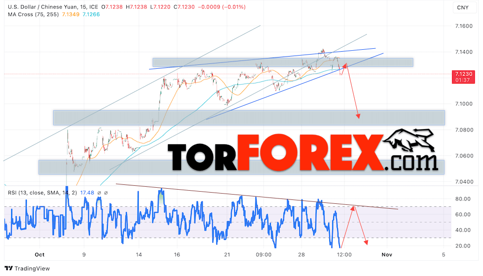 Дополнительным сигналом в пользу снижения валютной пары USD/CNY 31 октября 2024 выступит тест медвежьей линии тренда на индикаторе относительной силы (RSI). Вторым сигналом станет отскок от нижней границы разворотной модели «Клин». Отменой варианта снижения пары USD/CNY на Форекс станет сильный рост котировок и пробой уровня 7.1465 Юаней за Доллар. Это укажет на пробой области сопротивления и продолжение роста пары Доллар Китайский Юань в область выше уровня 7.1775. Подтверждением падению пары выступит пробой области поддержки и закрытие котировок актива под уровнем 7.1005.