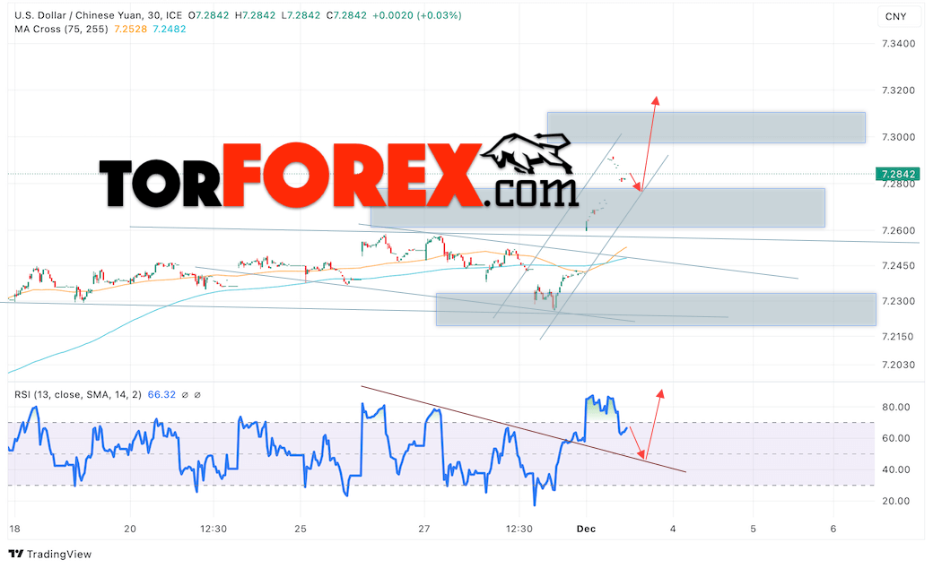 Валютная пара Доллар Китайский Юань USDCNY продолжает движение в рамках развития незначительной коррекции и восходящего канала. В момент публикации прогноза курс Доллара США к Китайскому Юаню составляет 7.2842. Скользящие средние указывают на наличие краткосрочной бычьей тенденции. Цены пробили область между сигнальными линиями вверх, что указывает на давление со стороны покупателей американской валюты и потенциальное продолжение роста Доллара США против Китайского Юаня. В рамках прогноза курса Доллара на 4 декабря 2024 стоит ожидать попытку развития падения цены и тест уровня поддержки вблизи отметки 7.2775 Юаней за Доллар США. Затем, отскок вверх и продолжение роста валютной пары в область выше уровня 7.3205.