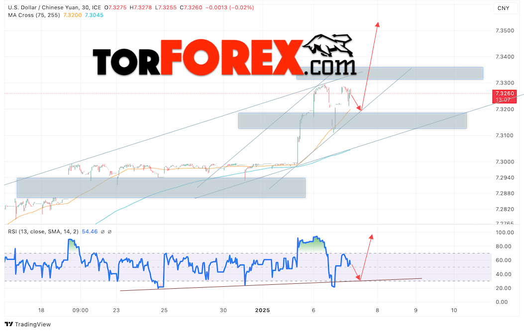 Валютная пара Доллар Китайский Юань USDCNY продолжает движение в рамках развития коррекции и бычьего канала. В момент публикации прогноза курс Доллара США к Китайскому Юаню составляет 7.3260. Скользящие средние указывают на наличие краткосрочной бычьей тенденции. Цены пробили область между сигнальными линиями вверх, что указывает на давление со стороны покупателей американской валюты и потенциальное продолжение роста Доллара США против Китайского Юаня. В рамках прогноза курса Доллара на 8 января 2025 стоит ожидать попытку развития падения цены и тест уровня поддержки вблизи отметки 7.3205 Юаней за Доллар США. Затем, отскок вверх и продолжение роста валютной пары в область выше уровня 7.3585.