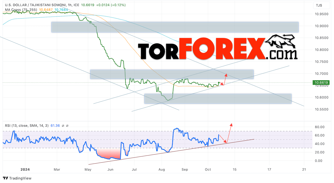 Дополнительным сигналом в пользу роста валютной пары USD/TJS 15 октября 2024 выступит пробой бычьей линии тренда на индикаторе относительной силы (RSI). Вторым сигналом станет отбой от нижней границы бычьего канала. Отменой варианта роста пары USD/TJS станет падение котировок и пробой уровня 10.6425 Сомони за Доллар. Это укажет на пробой области поддержки и продолжение падения пары Доллар Таджикский Сомони в область ниже уровня 10.6205. Подтверждением росту пары выступит пробой области сопротивления и закрытие котировок актива над уровнем 10.6725.