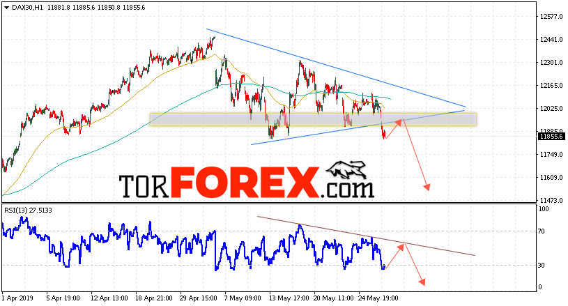 Таким образом, Индекс DAX 30 прогноз и аналитика на 30 мая 2019 предполагает попытку теста нижней границы модели «Треугольник» вблизи области 11985. Затем продолжение падения с потенциальной целью ниже уровня 11650. В пользу падения котировок выступит тест линии тренда на индикаторе относительной силы. Отменой варианта снижения станет сильный рост и пробой области 12165. Это укажет на продолжение подъёма в область выше 12450.