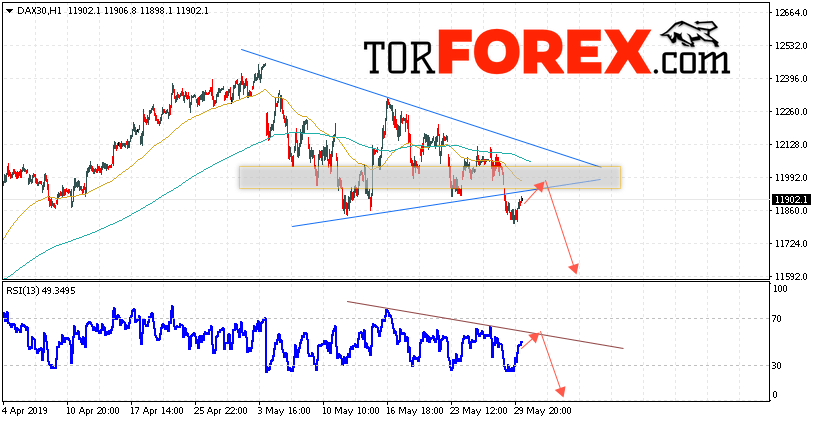 Таким образом, Индекс DAX 30 прогноз и аналитика на 31 мая 2019 предполагает попытку теста нижней границы модели «Треугольник» вблизи области 11985. Затем продолжение падения с потенциальной целью ниже уровня 11605. В пользу падения котировок выступит тест линии тренда на индикаторе относительной силы. Отменой варианта снижения станет сильный рост и пробой области 12165. Это укажет на продолжение подъёма в область выше 12550.