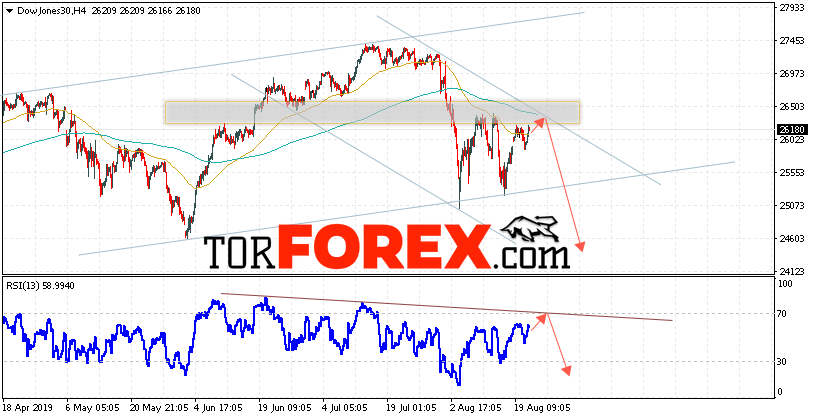 Таким образом, Dow Jones прогноз и аналитика на 22 августа 2019 предполагает попытку теста уровня сопротивления вблизи области 26255. Затем продолжение падения в область ниже уровня 24485. В пользу снижение котировок Dow Jones выступит тест линии тренда на индикаторе относительной силы. Отменой варианта падения станет сильный рост и пробой области 26975. Это укажет на продолжение подъёма с целью выше уровня 27655.