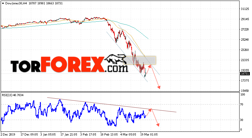 В пользу падения котировок биржевого индекса 24 марта 2020 выступит тест нисходящей линии поддержки на индикаторе относительной силы. Вторым сигналом станет отскок от верхней границы нисходящего канала. Отменой варианта падения котировок индекса станет сильный рост и пробой области 21650. Это укажет на пробой уровня сопротивления и продолжение роста Dow Jones с целью выше уровня 21955. Ожидать ускорения падения котировок Dow Jones стоит с пробоем области поддержки и закрытием под уровнем 17265.