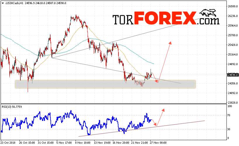 Таким образом, Dow Jones прогноз и аналитика на 28 ноября 2018 предполагает попытку теста нижней границы канала вблизи области 24350. Затем продолжение роста в область выше уровня 25450. В пользу роста котировок Dow Jones выступит тест линии поддержки на индикаторе относительной силы. Отменой варианта роста выступит сильное падение и пробой области 24000. Это укажет на продолжение снижения и отмену модели «Волна Вульфа».