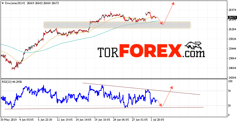 Таким образом, Dow Jones прогноз и аналитика на 3 июля 2019 предполагает попытку теста уровня поддержки вблизи области 26575. Затем продолжение роста в область выше уровня 27345. В пользу подъёма котировок Dow Jones выступит тест линии тренда на индикаторе относительной силы. Отменой варианта роста станет падение и пробой области 26230. Это укажет на продолжение снижения с целью ниже уровня 26010.