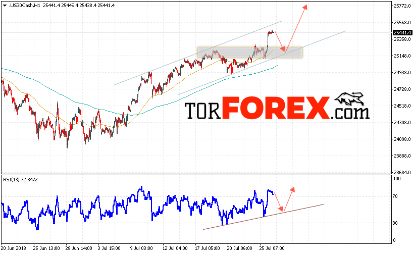 Таким образом, Dow Jones прогноз индекса на 27 июля 2018 предполагает попытку теста нижней границы канала вблизи области 25250 и продолжение роста в область выше уровня 25770, в пользу роста котировок Dow Jones выступит тест линии поддержки на индикаторе относительной силы.