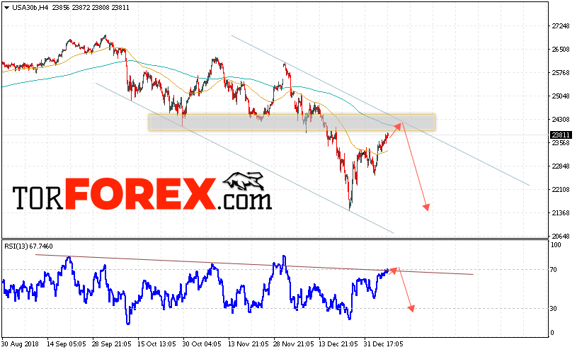 Таким образом, Dow Jones прогноз индекса на 10 января 2019 предполагает попытку теста верхней границы канала вблизи области 2420. Далее, продолжение падения в область ниже уровня 21360. В пользу снижения котировок Dow Jones выступит тест линии сопротивления на индикаторе относительной силы. Отменой варианта падения станет сильный рост и пробой уровня 24450.