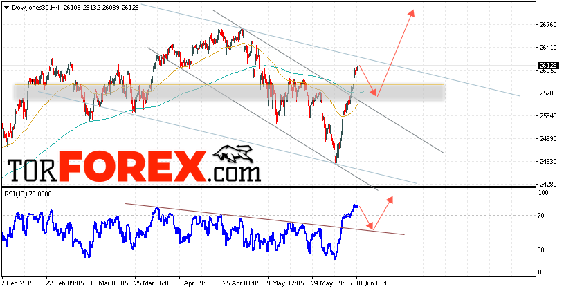 Таким образом, Dow Jones прогноз и аналитика на 11 июня 2019 предполагает попытку теста уровня поддержки вблизи области 25700. Затем продолжение роста в область выше уровня 26865. В пользу подъёма котировок Dow Jones выступит тест линии тренда на индикаторе относительной силы. Отменой варианта роста выступит падение и пробой области 25155. Это укажет на продолжение снижения с целью ниже уровня 24630.