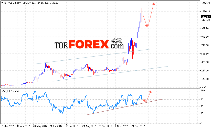 Таким образом, Ethereum прогноз на неделю 15 — 19 января 2018 предполагает попытку теста области поддержки вблизи уровня 1000, откуда стоит ожидать отскок и продолжения роста в область выше уровня 1450, дополнительным сигналом в пользу роста Ethereum выступит тест линии поддержки на индикаторе относительной силы.