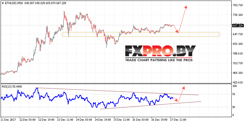 Таким образом, Курс Ethereum (ETH/USD) прогноз на 18 декабря 2017 предполагает попытку теста области поддержки вблизи уровня 650, откуда стоит ожидать отскок и продолжения роста в область выше уровня 780, дополнительным сигналом в пользу роста Ethereum выступит тест линии поддержки на индикаторе относительной силы.