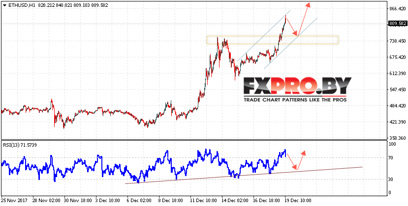 Таким образом, Курс Ethereum (ETH/USD) прогноз на 20 декабря 2017 предполагает попытку теста области поддержки вблизи уровня 760, откуда стоит ожидать отскок и продолжения роста в область выше уровня 880, дополнительным сигналом в пользу роста Ethereum выступит тест линии поддержки на индикаторе относительной силы.