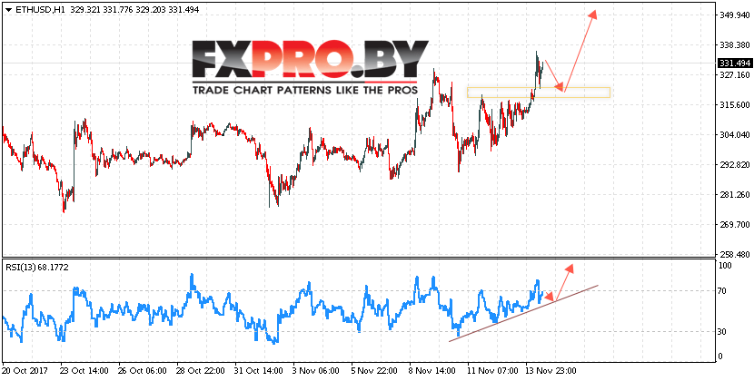 Таким образом, Курс Эфириум (Ethereum) прогноз на 15 ноября 2017 предполагает попытку теста уровня поддержки вблизи 325 и продолжения роста в область выше уровня 350 в рамках отскока от уровня поддержки, дополнительным сигналом в пользу роста курса Эфириум выступит тест линии поддержки на индикаторе относительной силы.