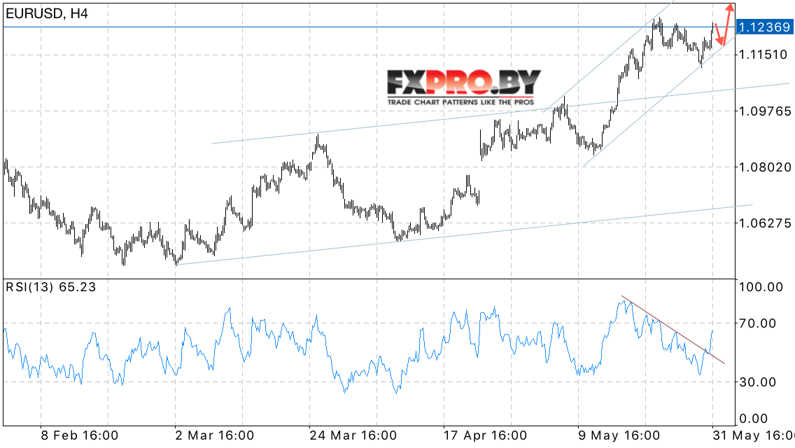 Таким образом, EUR/USD прогноз Евро Доллар на 1 июня 2017 предполагает попытку падения теста нижней границы восходящего канала и продолжения роста в область выше уровня 1.13, отменой варианта роста евро доллар на Форекс станет падение и пробой области 1.1150.