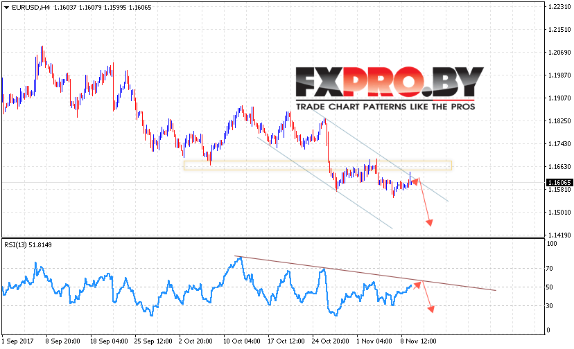 Таким образом, EUR/USD прогноз Евро Доллар на 10 ноября 2017 предполагает попытку теста верхней границы канала вблизи 1.1615, откуда стоит ожидать продолжения падения пары ниже уровня 1.1420, дополнительным сигналом в пользу снижения EUR/USD выступит тест линии сопротивления на индикаторе относительной силы, отменой варианта падения пары EUR/USD станет пробой уровня сопротивления и закрытие выше 1.1670, что укажет на выход котировок за пределы канала и продолжение роста курса евро.