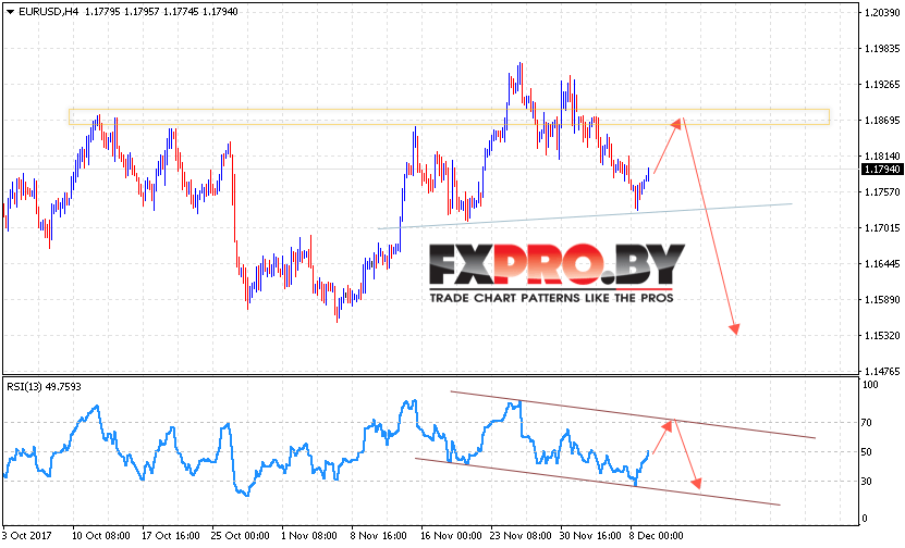 Таким образом, EUR/USD прогноз Евро Доллар на 12 декабря 2017 предполагает попытку  теста уровня сопротивления вблизи 1.1870, откуда стоит ожидать продолжения падения в область ниже 1.1530, в рамках начала отработки разворотной модели «Голова и плечи», в пользу падения выступит тест верхней границы канала на индикаторе относительной силы, отменой варианта снижения EUR/USD станет пробой уровня 1.1970, что укажет на продолжение роста.