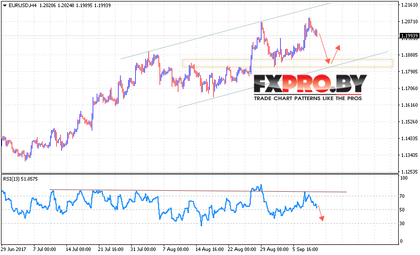 Таким образом, EUR/USD прогноз Евро Доллар на 12 сентября 2017 предполагает попытку падения в область нижней границы восходящего канала вблизи области 1.1850, откуда вновь стоит ожидать продолжения роста евро с целью вблизи области 1.1950.