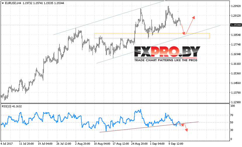 Таким образом, EUR/USD прогноз Евро Доллар на 14 сентября 2017 предполагает попытку теста нижней границы восходящего канала вблизи области 1.1850, дополнительным сигналом в пользу снижения выступает пробой линии тренда на индикаторе относительной силы, отменой станет сильный рост и пробой области 1.21.