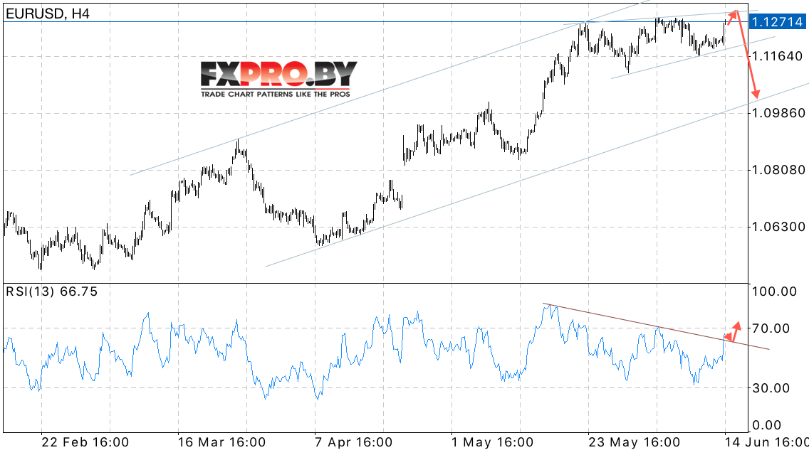 Таким образом, EUR/USD прогноз Евро Доллар на 15 июня 2017 предполагает попытку теста верхней границы модели Клин и начала снижения с потенциальной целью вблизи уровня 1.10, отменой станет пробой области 1.1350, что укажет на продолжение роста в область выше уровня 1.1450.