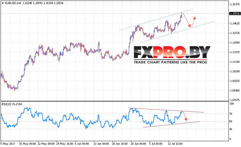 Таким образом, EUR/USD прогноз Евро Доллар на 19 июля 2017 предполагает попытку коррекции в область нижней границы восходящего канала, дополнительным сигналом в пользу снижения евро выступает тест линии сопротивления на индикаторе относительной силы.