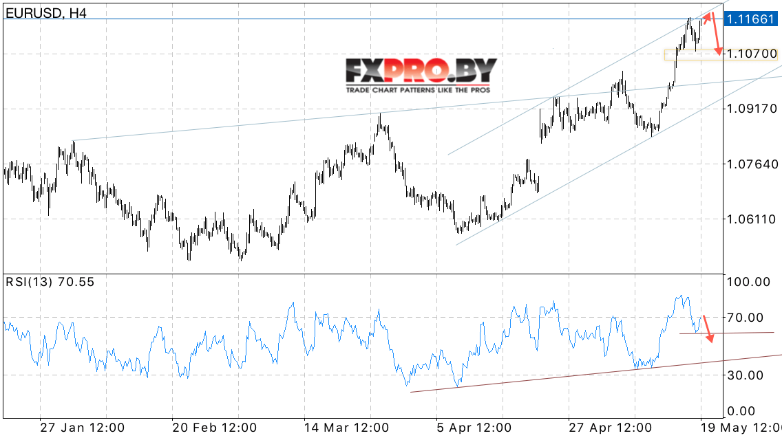 Валютная пара евро доллар EUR/USD продолжает торговаться вблизи верхней границы восходящего канала. Сохраняется потенциал для отскока и падения котировок в область ниже уровня 1.1070. В пользу падения выступает формирование разворотной Форекс модели Неудавшийся размах на индикаторе относительной силы.