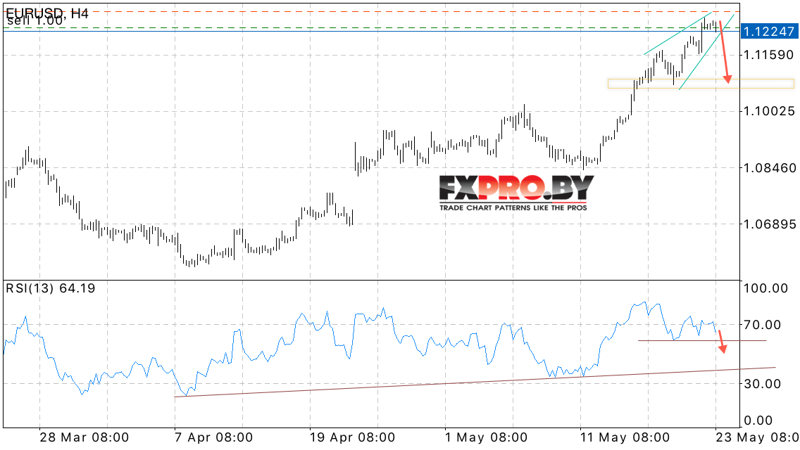 Таким образом, EUR/USD прогноз Евро Доллар на 24 мая 2017 предполагает попытку падения пробоя нижней границы модели Клин и начала падения в область ниже уровня 1.11, дополнительным сигналом выступает формирование разворотной модели на индикаторе относительной силы, отменой станет пробой области 1.1280.