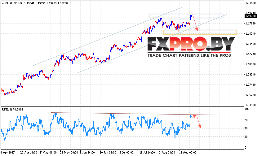 Таким образом, EUR/USD прогноз Евро Доллар на 29 августа 2017 предполагает попытку падения с текущим уровней с потенциальной целью снижения вблизи области 1.1640, дополнительным сигналом выступает тест линии тренда на индикаторе относительной силы, отменой станет пробой уровня 1.2150.