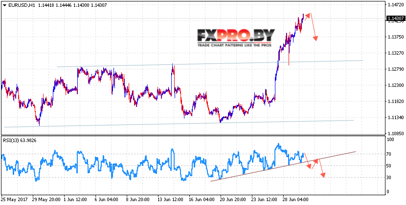 Таким образом, EUR/USD прогноз Евро Доллар на 30 июня 2017 предполагает попытку снижения в область ниже уровня 1.1370 в рамках отработки разворотной модели Неудавшийся рамках на индикаторе относительной силы, дополнительным сигналом выступит пробой линии поддержки.