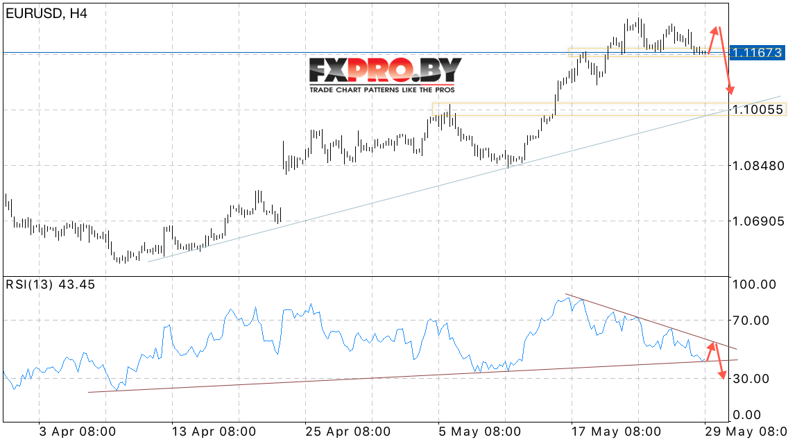 С пробоем данной линии стоит ожидать продолжения падения и тест аналогичной линии тренда на графике цены с целью на уровне 1.1005. В случае пробоя области локального максимума, стоит ожидать продолжения роста пары EUR/USD.