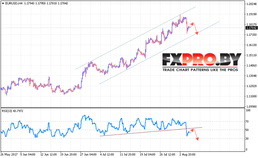 Таким образом, EUR/USD прогноз Евро Доллар на 8 августа 2017 предполагает попытку падения в область нижней границы канала на уровне 1.1715, дополнительным сигналом выступает тест пробитой линии тренда на индикаторе относительной силы.