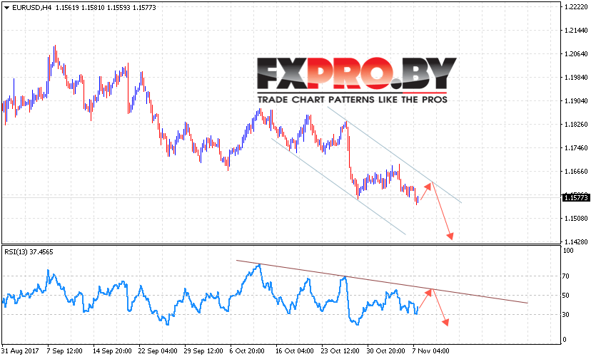 Таким образом, EUR/USD прогноз Евро Доллар на 8 ноября 2017 предполагает попытку теста верхней границы канала вблизи 1.1605, откуда стоит ожидать продолжения падения пары ниже уровня 1.1420, дополнительным сигналом в пользу снижения выступит тест линии сопротивления на индикаторе относительной силы, отменой варианта падения пары EUR/USD станет пробой уровня 1.1650, что укажет на выход котировок за пределы канала и продолжение роста.
