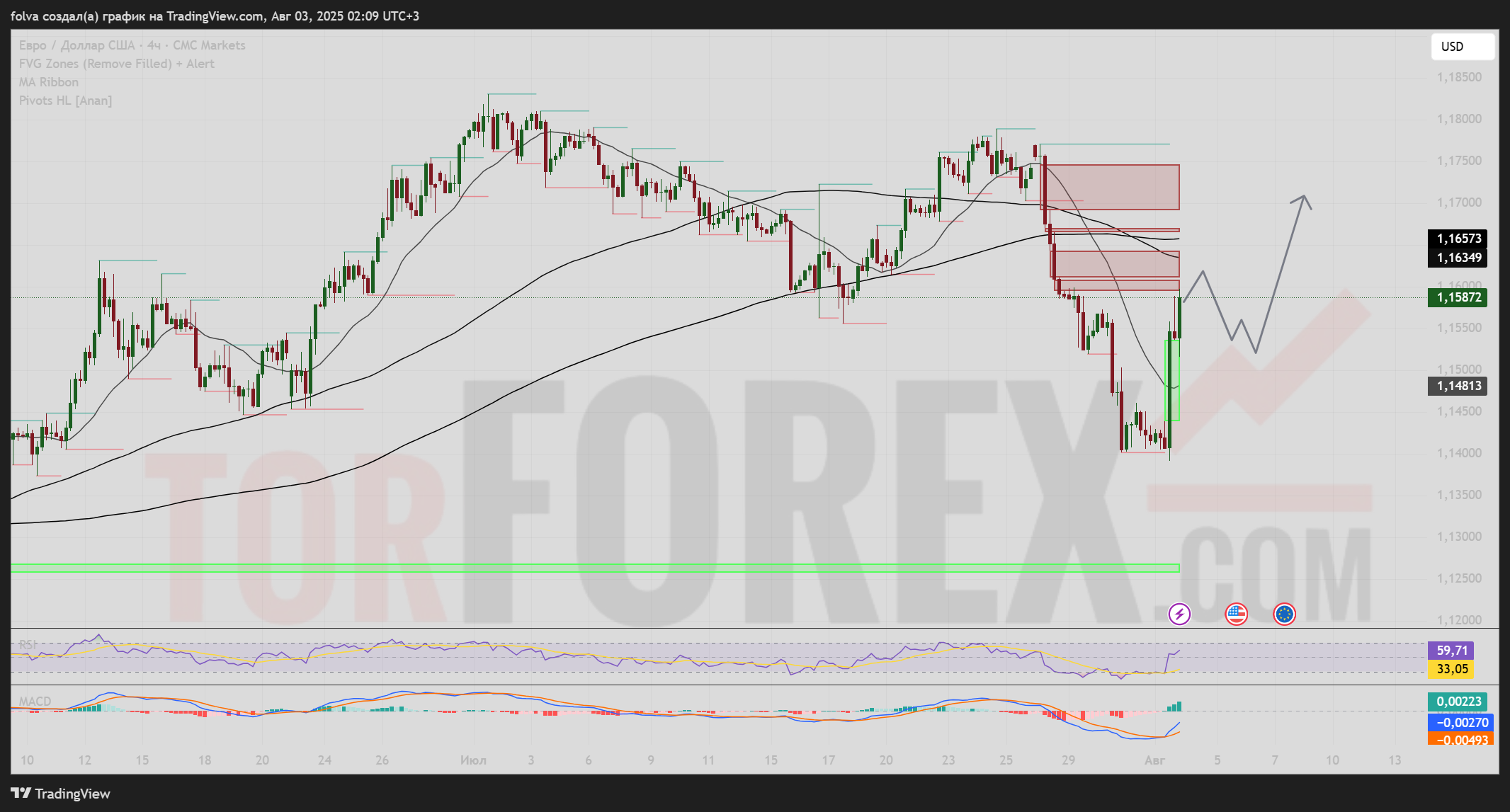 После резкого распродажного импульса в конце июля пара EUR/USD сформировала разворотный бар-“поглощение” на четырёхчасовом таймфрейме и закончила неделю у 1,1587. На графике виден пробой внутренней FVG-зоны, что указывает на переход продавцов в режим фиксации прибыли. Ниже представлен подробный технический прогноз на неделю 4 – 10 августа 2025 г. с опорой на Pivot Points HL, EMA Ribbon, FVG-зоны, RSI и MACD.