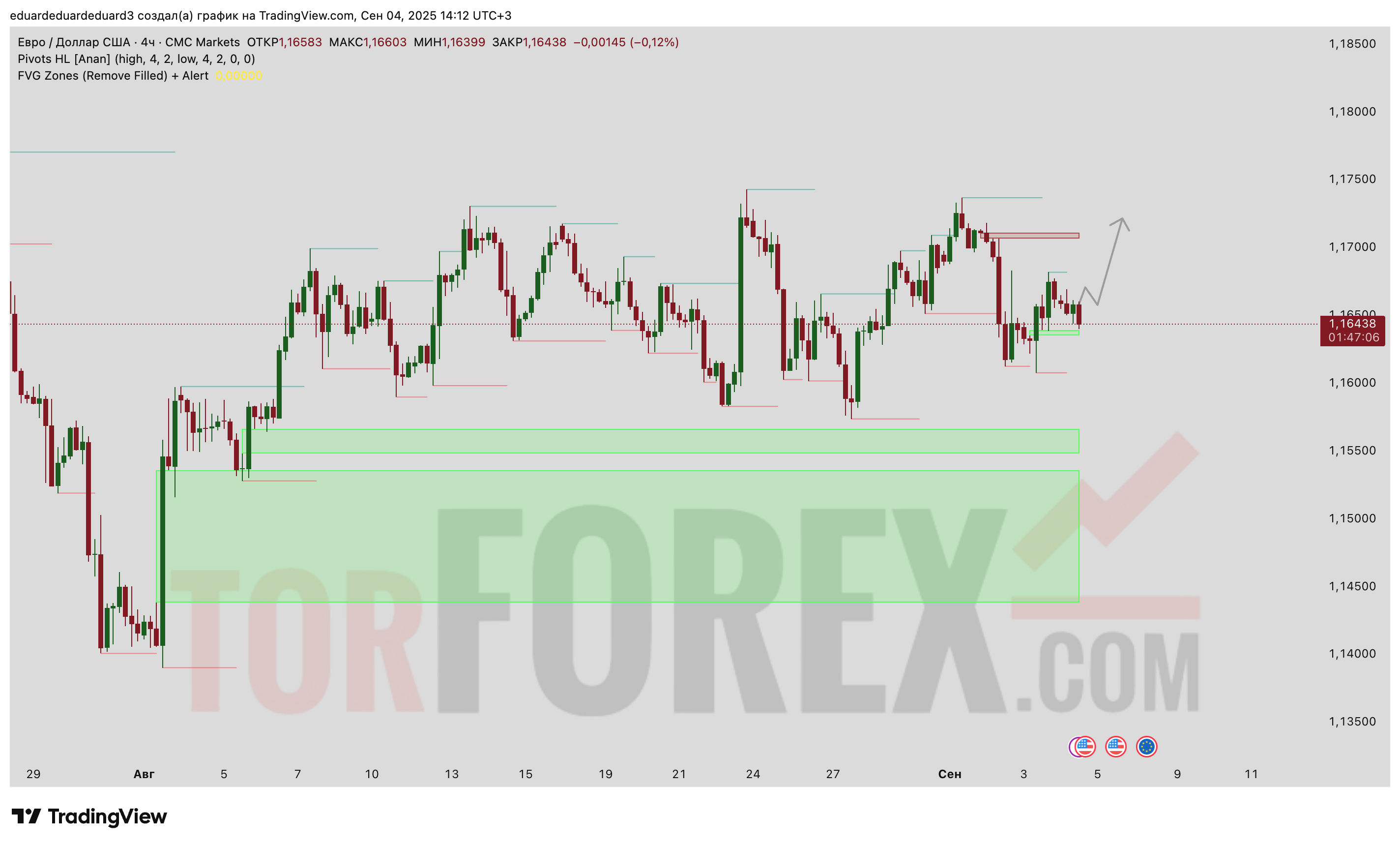 Поддержка: область 1,1550–1,1500, которая совпадает с FVG-зоной и историческим Order Block. Эта зона является ключевой для удержания бычьего сценария.