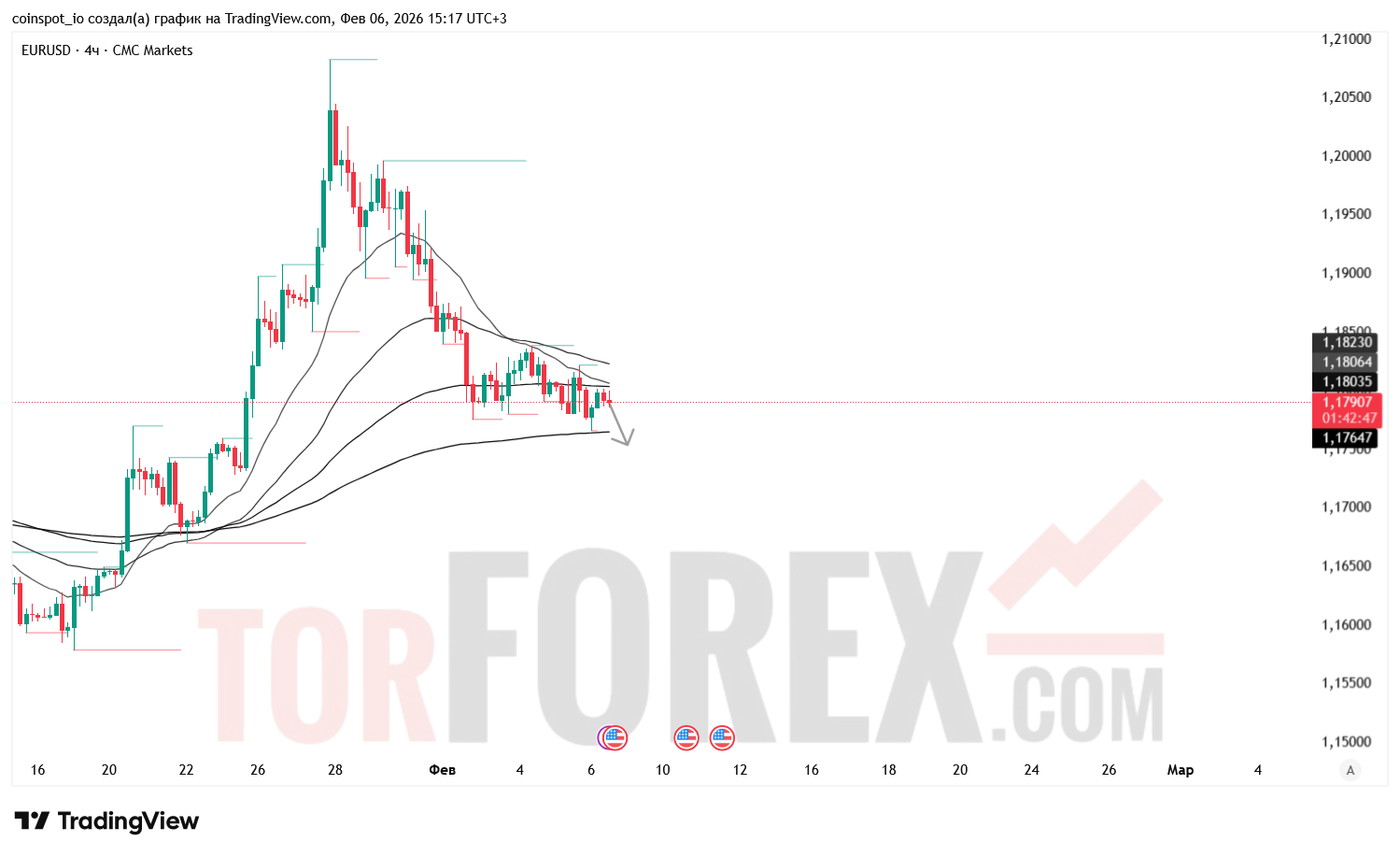 Торговая пара EUR/USD подходит к 7 февраля 2026 года в фазе умеренного восстановления после обновления локального минимума. Цена поднимается к области 1.1790–1.1800, формируя слабый бычий импульс на фоне снижения волатильности. Несмотря на попытку роста, структура рынка остаётся преимущественно медвежьей: последовательность pivot‑точек сохраняет нисходящий характер, EMA‑лента направлена вниз, а зоны FVG смещены в сторону понижения. Текущая динамика указывает на коррекционный характер движения, без подтверждённых признаков разворота.