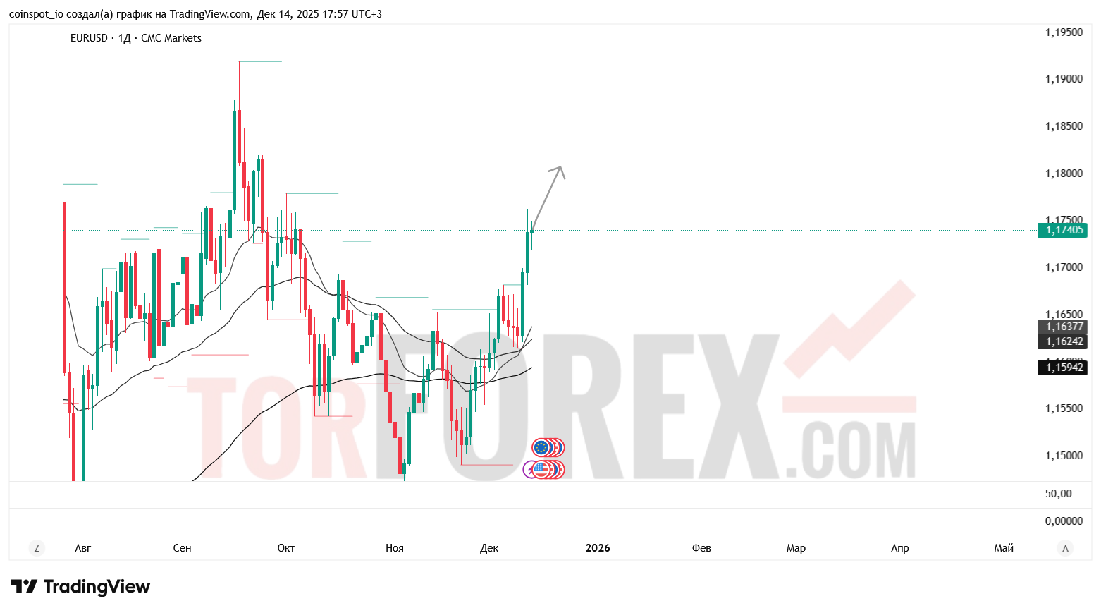 На неделю 14–21 декабря 2025 года EUR/USD демонстрирует признаки консолидации с потенциалом к росту. Основной сценарий — движение к 1.17750–1.18000 USD при пробое сопротивления. Альтернативный сценарий — снижение к 1.15940–1.15500 USD при отказе от уровня 1.17500 USD.